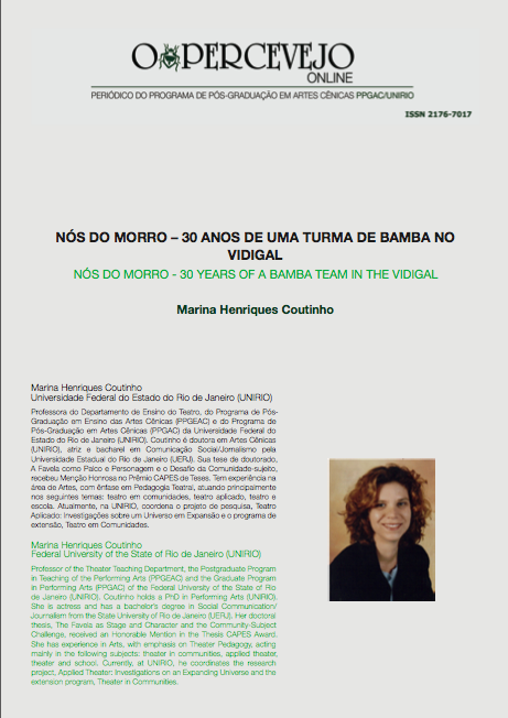 RESUMO: O artigo analisa aspectos da trajetória de trinta anos do grupo de teatro Nós do Morro, da favela do Vidigal, situando-o como experiência pioneira e marco na História do Teatro Brasileiro. Aborda a dramaturgia de Luiz Paulo Corrêa e Castro como fundamento para a expressão da voz de sua comunidade-mãe. O texto também investiga a contribuição da produção artística do grupo como estímulo para a formação de novos coletivos teatrais, oriundos dos espaços populares, e seu potencial para lutar pelo direito à cidade. Palavras-chave: Nós do Morro; História; Teatro; Favela; Cidade ABSTRACT: This article analyzes aspects of the thirty-year trajectory of the theater group Nós do Morro, from the Vidigal favela, situating it as a pioneering and landmark experience in the History of the Brazilian Theater. It addresses the dramaturgy of Luiz Paulo Corrêa e Castro as a basis for the expression of the voice of its mother community. The text also investigates the contribution of the artistic production of the group as a stimulus for the formation of new theatrical collectives, coming from the popular spaces, and its potential to fight for the right to the city. Keywords: Nós do Morro Group; History; Theater; Slum; CityDownloads