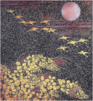 Em uma pairante leveza é firmemente descrito o momento de um acontecimento natural. Através de diagonais, que se entrecruzam, através de movimentos antagônicos, através de surpreendentes relações de grandeza, através do contraste da disseminação de ouro e prata, através da indicação de uma grande paisagem e de coisas mínimas. A contraposição da lua tranquila e da grama em movimento, separadas e ligadas através dos gansos selvagens que chegam voando no contravento, tudo isso articula uma constelação admirável, na qual o nada é transformado em algo poético.